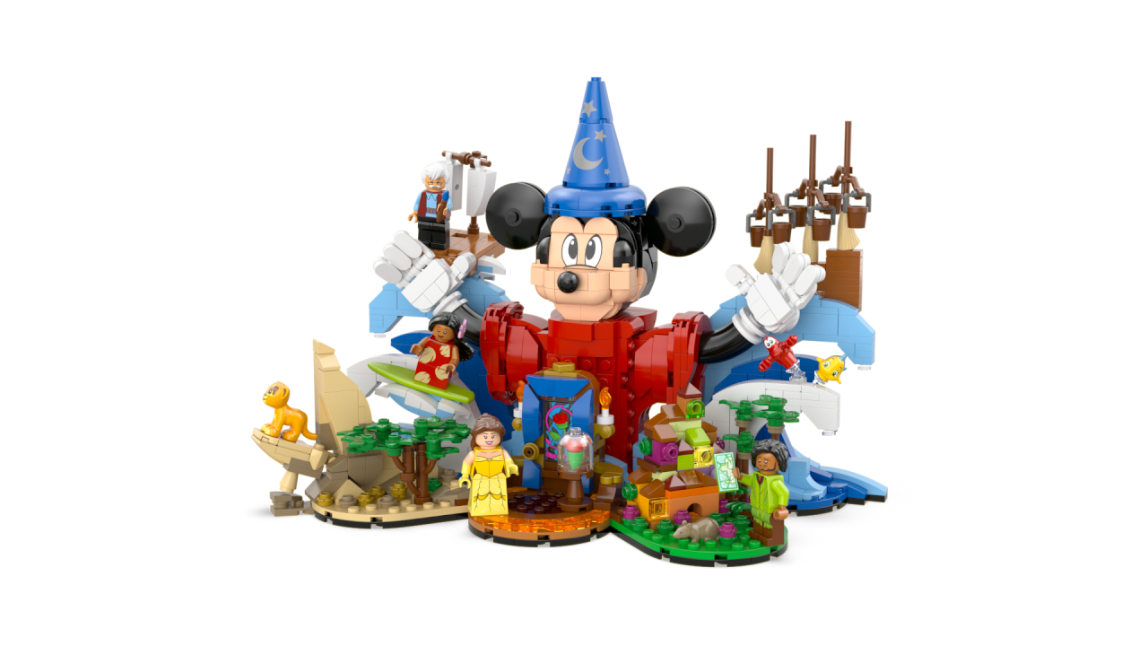 With Mickey Mouse in his sorcerer’s apprentice outfit at the centre, this collectible model showcases many popular Disney characters and includes the first-ever LEGO minifigure of Belle from Beauty and the Beast with the enchanted rose. Other vignettes include Geppetto on a raft in Pinocchio, Lilo surfing in Lilo & Stitch, Simba atop Pride Rock in The Lion King, Bruno at Madrigal House in Encanto, the magic Brooms carrying water in Fantasia and Sebastian the crab and Flounder the fish in The Little Mermaid.