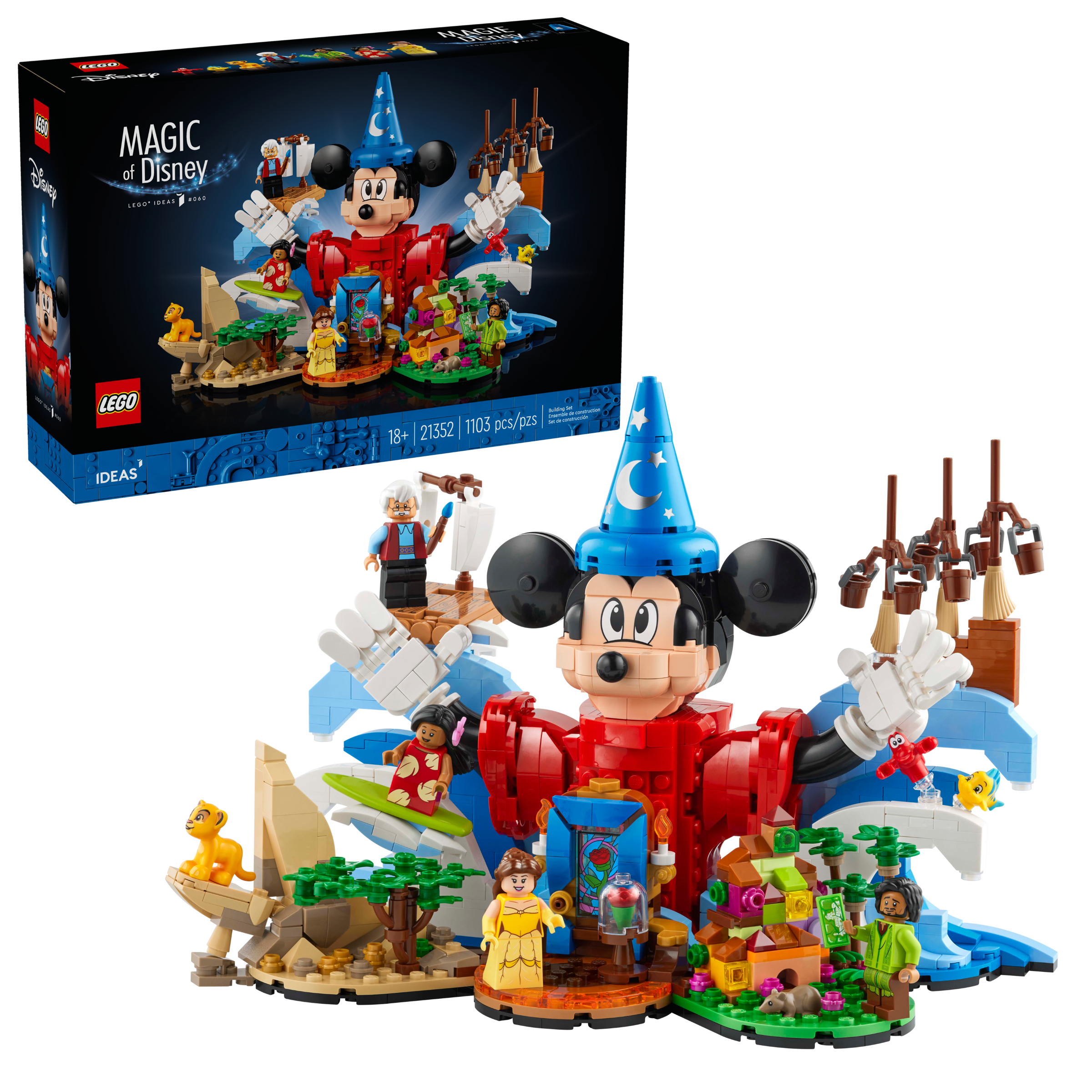 - Iconic Disney characters – A buildable Mickey Mouse figure, Belle, Geppetto, Bruno and Lilo minifigures, plus Simba, Sebastian, Flounder and 3 Broom figures