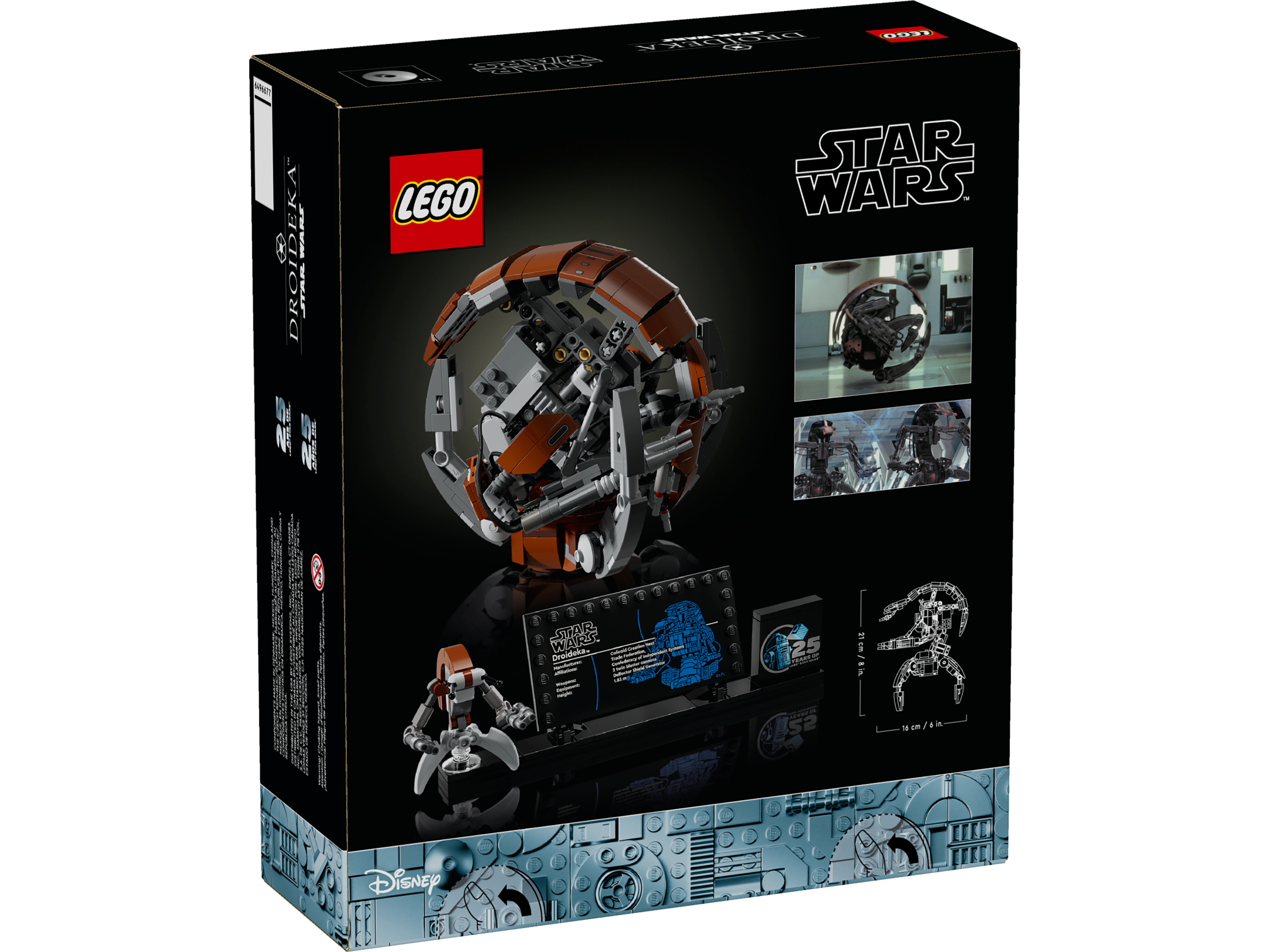 - 25th anniversary centerpiece – This unique set includes a stand with space for the small LEGO® droid figure of a Droideka, a Droideka information plaque and a LEGO Star Wars™ 25th anniversary brick