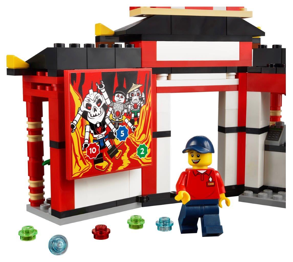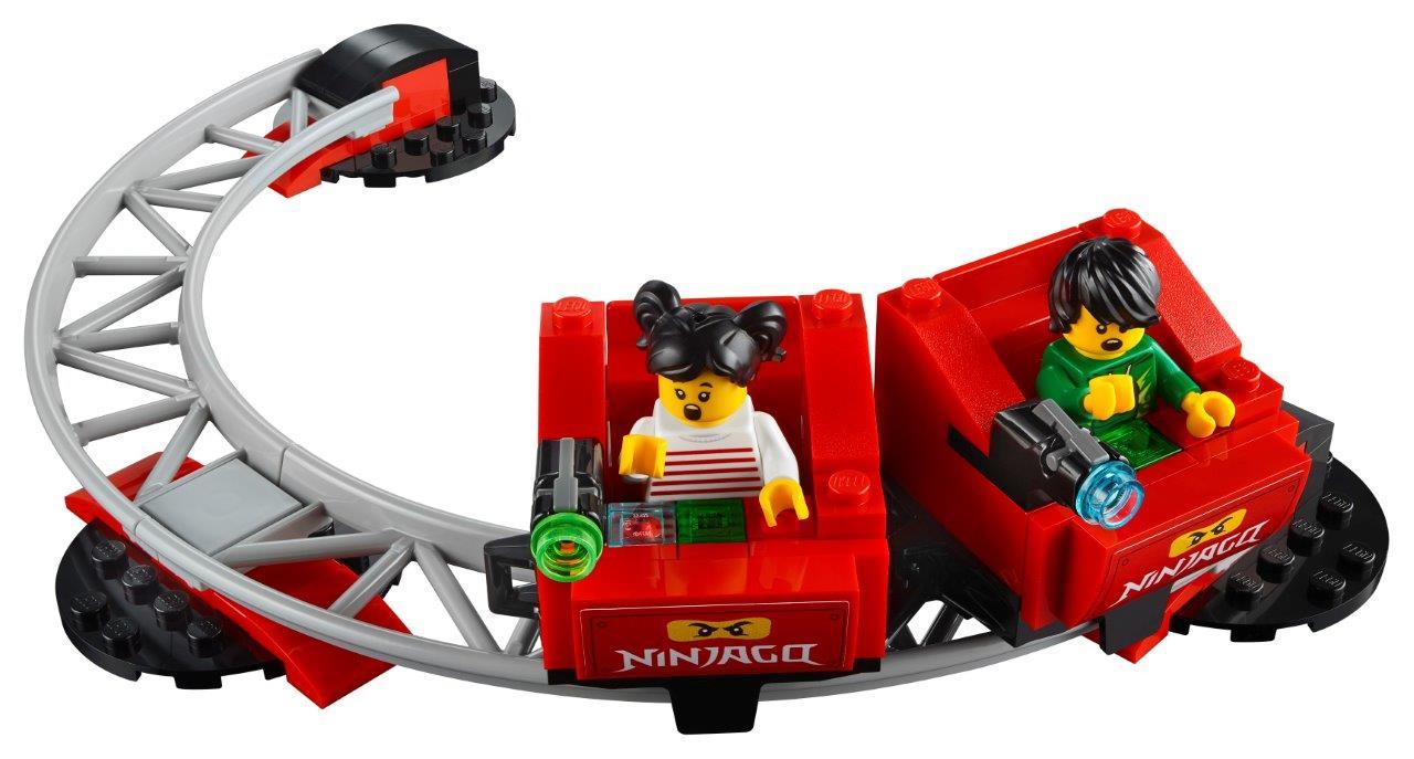 Inspire kids to build their own replica version of the LEGOLAND NINJAGO World ride. It's packed with amazing details just like the real thing. Check out the entrance fa?ade, roller-coaster with cool shooter function and screens with sticker detail for target practice. Only available at LEGOLAND! The set includes a LEGOLAND park map accessory and 4 minifigures for role play fun. Minifigures include a LEGOLAND employee, a mom, boy with a unique NINJAGO hoodie and a girl with face decoration.