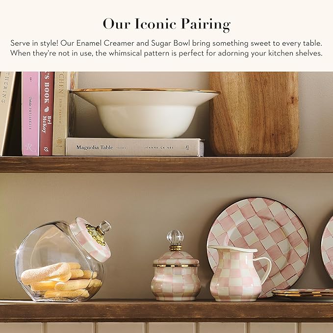 Enamel Creamer and Sugar-Bowl Set, Cream Dispenser and Sugar Holder, Unique Kitchen Decor, Pink-and-White Rosy Check