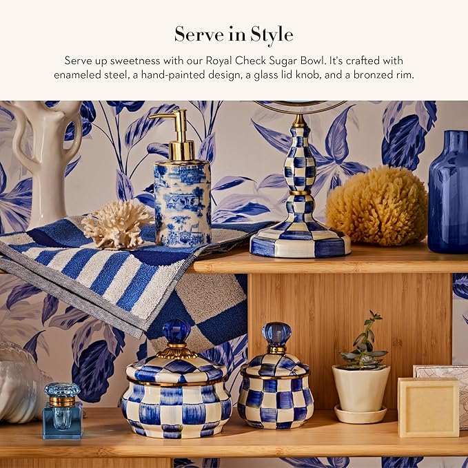 Enamel Lidded Sugar Bowl, Small Serving Bowl with Lid, 10-Ounce Capacity, Blue-and-White Royal Check