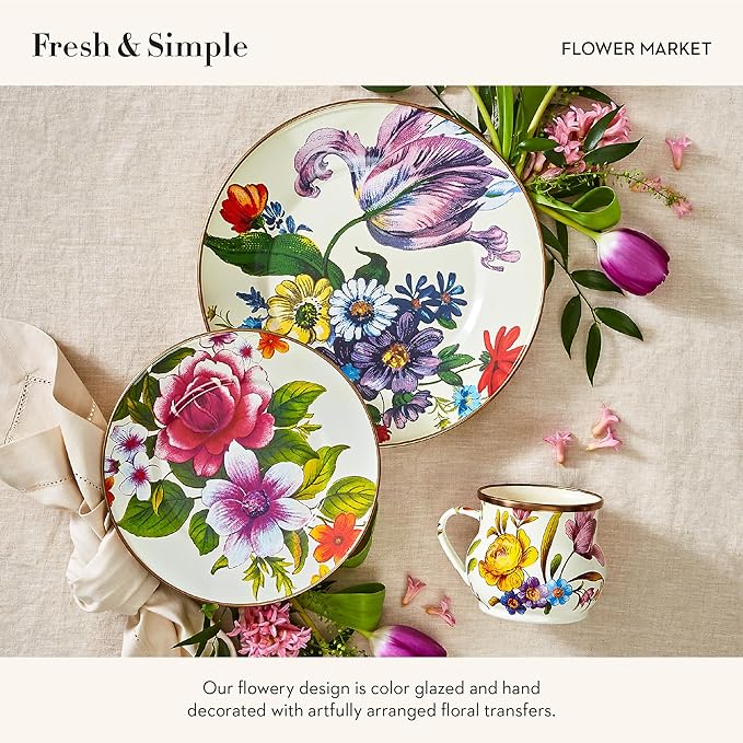 Enamel Mug, Cute Enamelware Coffee and Tea Mug, Unique Drinkware, 16 Ounces, White Flower Market, Set of 4