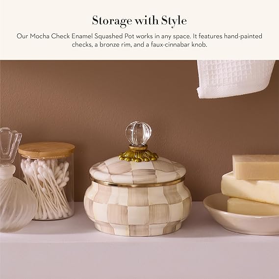 Enamel Squashed Pot, Cute Enameled Container with Lid, 20 Ounces, Brown-and-White Mocha Check