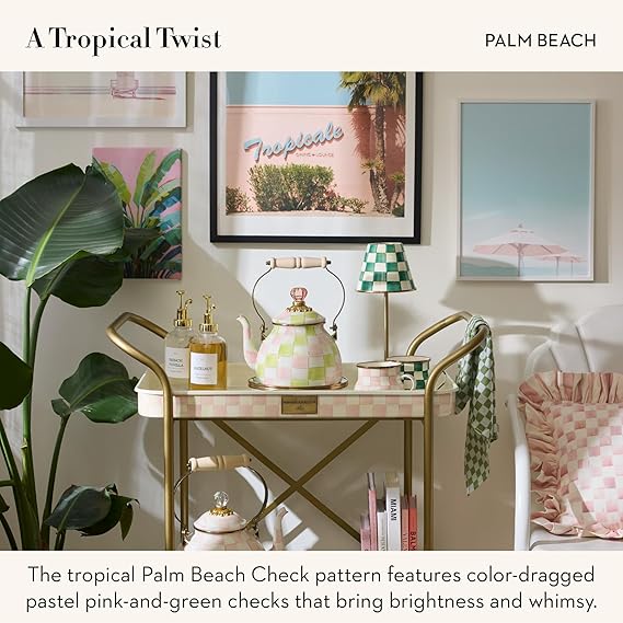 Enamel Tea Kettle, Cute Tea Kettle for Stovetop, 2 Quarts, Pastel Pink-and-Green Palm Beach Check