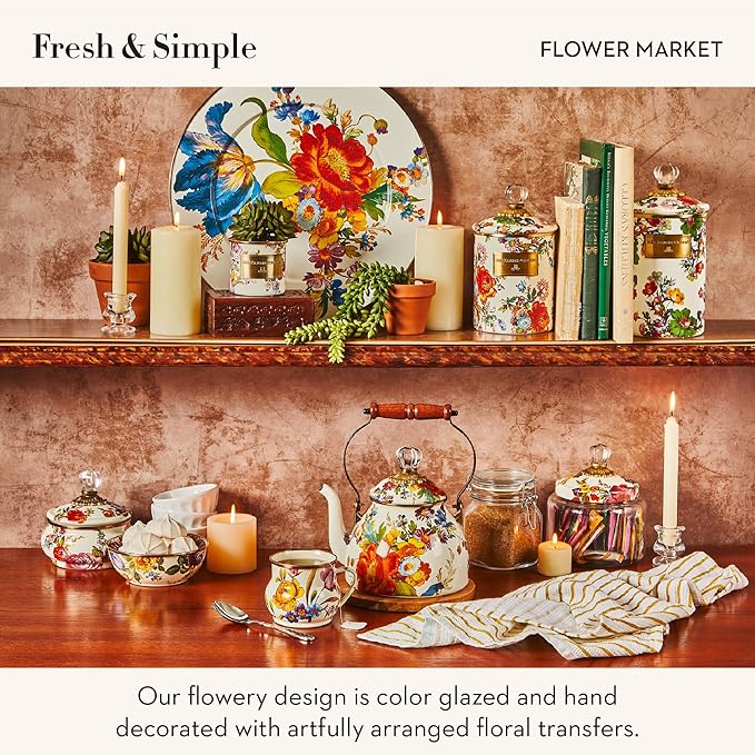 Enamel Tea Kettle, Stylish Tea Kettle for Stovetop, White Flower Market, 2 Quarts