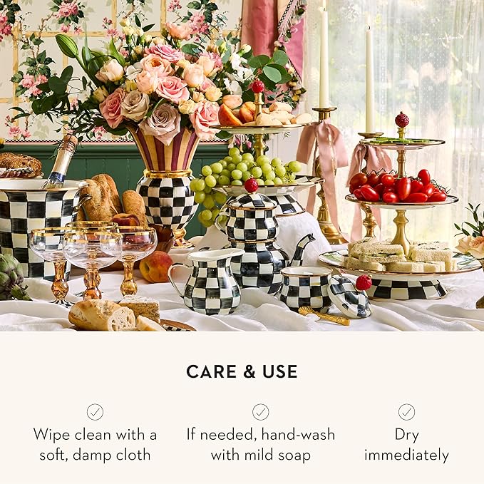 Enamel Two-Tier Sweet Stand, Two-Tiered Serving Tray for Dessert, Black-and-White Courtly Check