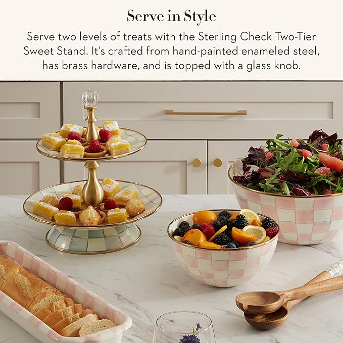Enamel Two-Tier Sweet Stand, Two-Tiered Serving Tray for Dessert, Gray-and-White Sterling Check
