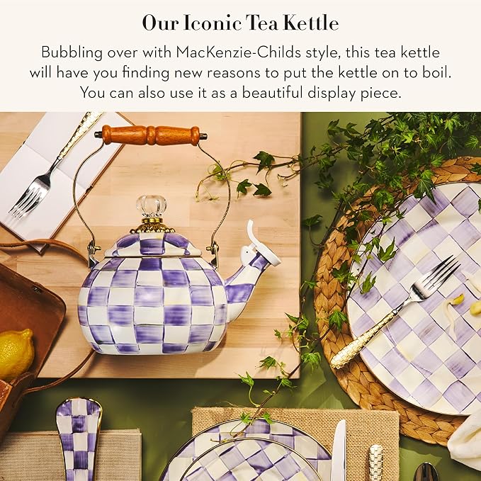Enamel Whistling Tea Kettle, Decorative Teapot, 2 Quarts, Purple-and-White Violet Check