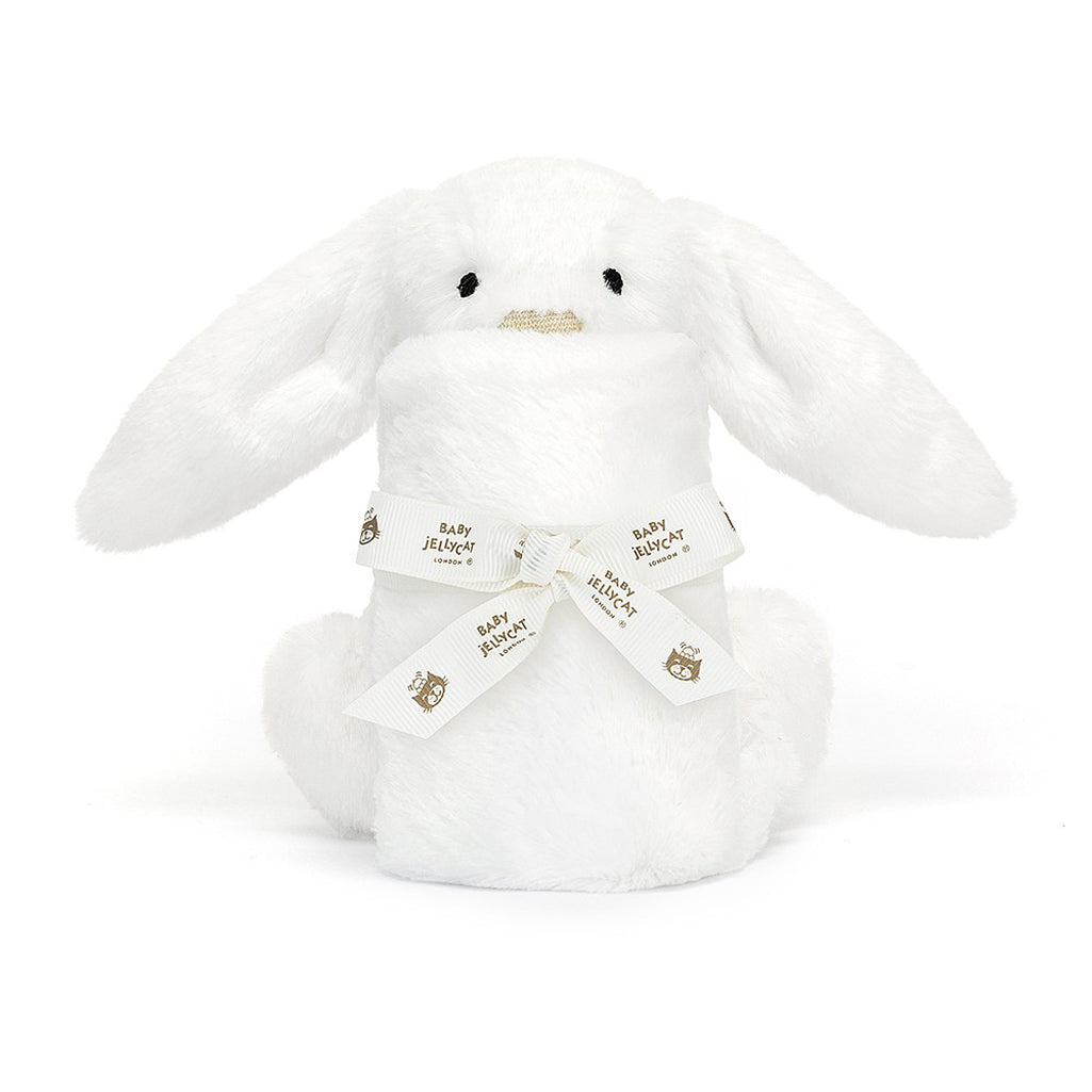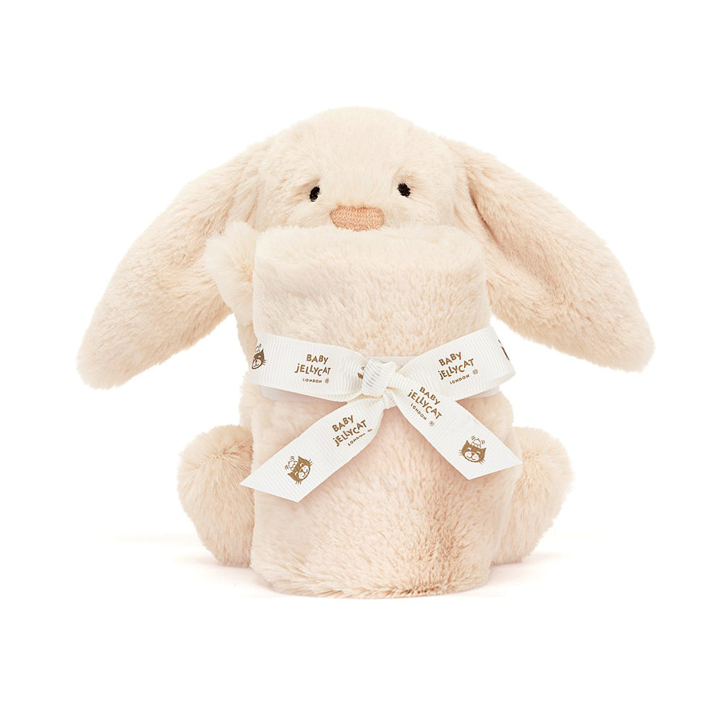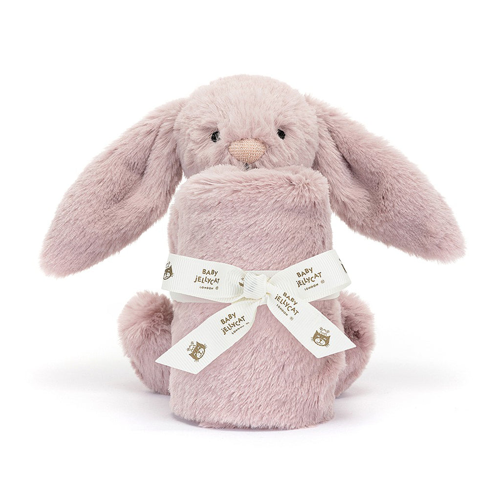 A luxurious newborn gift, Bashful Luxe Bunny Blankie is exquisitely soft. Featuring the head and paws of the beloved Jellycat Bashful Bunny in the corner of a silky soft blanket. Rolled and wrapped with a grosgrain ribbon and elegantly presented in a satin sheen gift box with a gold foil detail and matching gift card.