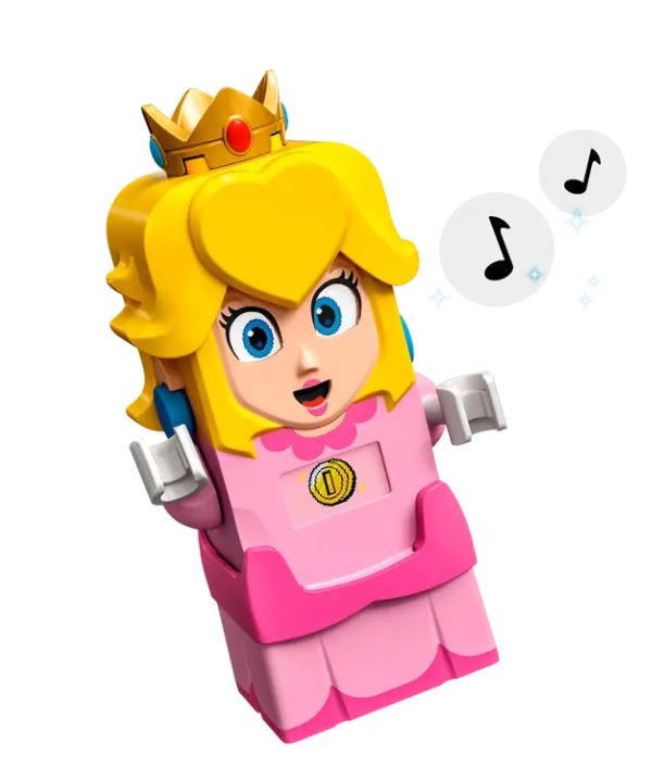 - Interactive LEGO Peach figure Features a color sensor, an LCD screen to display various instant reactions to movement, and a speaker that plays iconic sounds and music from the video games