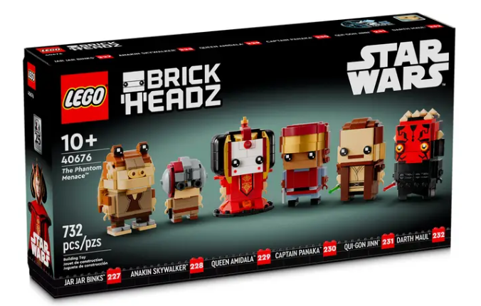 Celebrate the 25th anniversary of?Star?Wars: The Phantom Menace and LEGO?Star?Wars building sets with this build-and-display set of 6 collectible LEGO BrickHeadz figures (40676). A cool anytime gift for?Star?Wars?fans, it features brick-built LEGO figures of Jar Jar Binks, Anakin Skywalker, Queen Amidala, Captain Panaka, Qui-Gon Jinn and Darth Maul, each with baseplates, plus authentic accessories such as young Anakin's hammer and Darth Maul's red double-bladed lightsaber.