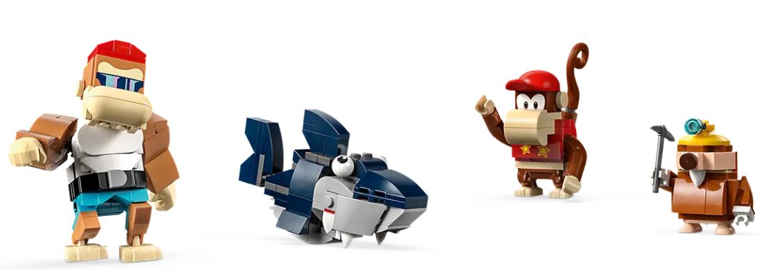 - 4 LEGO Super Mario figures from the Donkey Kong world Funky Kong and Diddy Kong, plus a Snaggles to flip out of the way and a Mole Miner to defeat