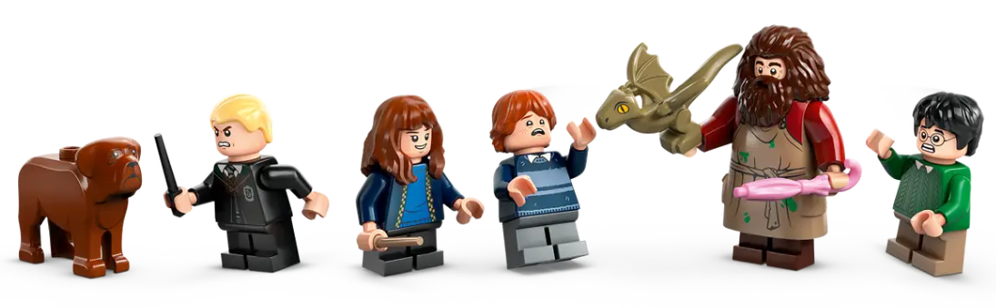 - 7 LEGO Harry Potter characters Harry Potter, Hermione Granger, Ron Weasley, Draco Malfoy and Rubeus Hagrid minifigures, plus LEGO figures of Norbert the dragon and Hagrid's dog Fang