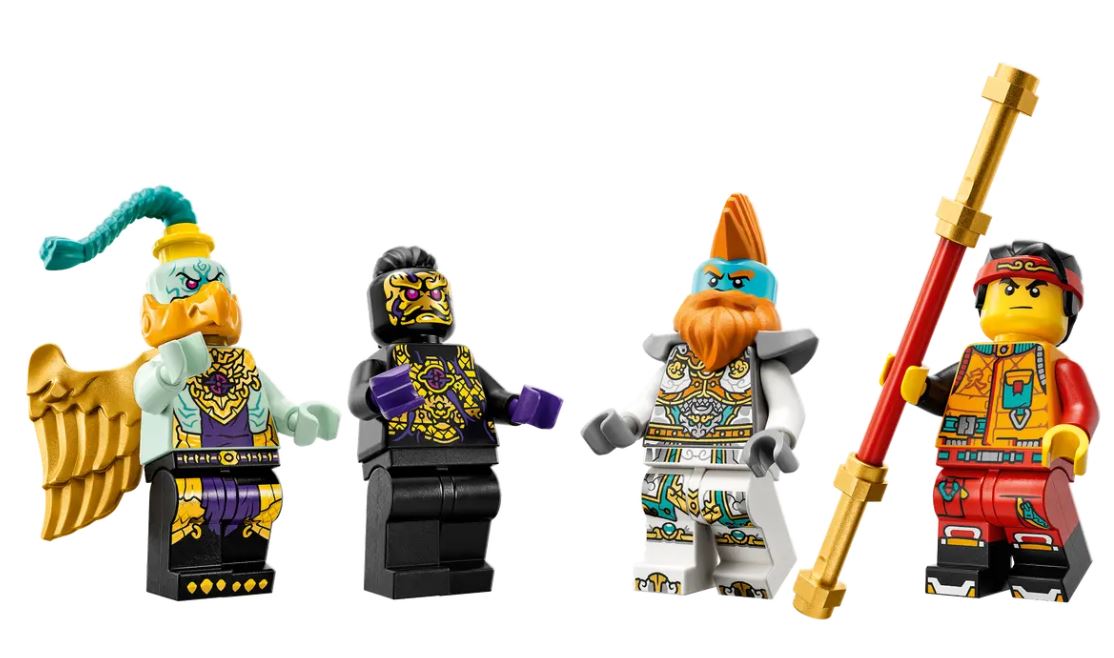 - 4 LEGO minifigures Monkie Kid, Sandy in a power-up suit, Ink Demon, and The Golden-Winged Eagle, and a Mo LEGO cat figure. Also includes Sandy's ancestral weapon, Ink Demon's crossbow and more