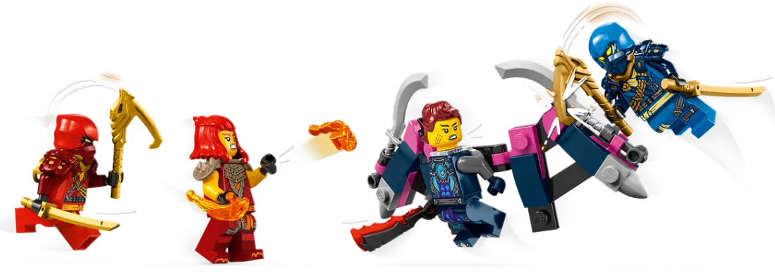 - 4 NINJAGO minifigures This ninja toy includes Climber Kai and Climber Jay, each with a katana sword accessory, Wyldfyre with 2 flammable fists, and Jordana with a glider vehicle