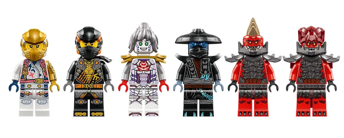 - 6 LEGO NINJAGO minifigures This adventure playset includes ninjas Sora and Cole and their ally Pixal, who take on the villainous trio of Nokt, a Dragonian Warrior and a Dragonian Scout