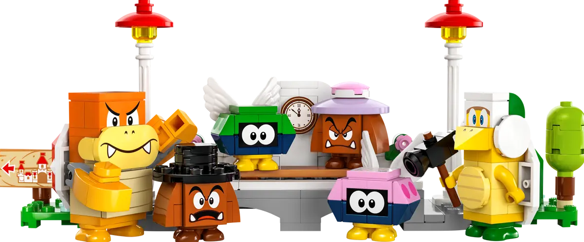 - Adventure playset featuring 6 LEGO Super Mario toy figures A Hammer Bro, Boom Boom, 2 Goombas and 2 Para-Biddybuds