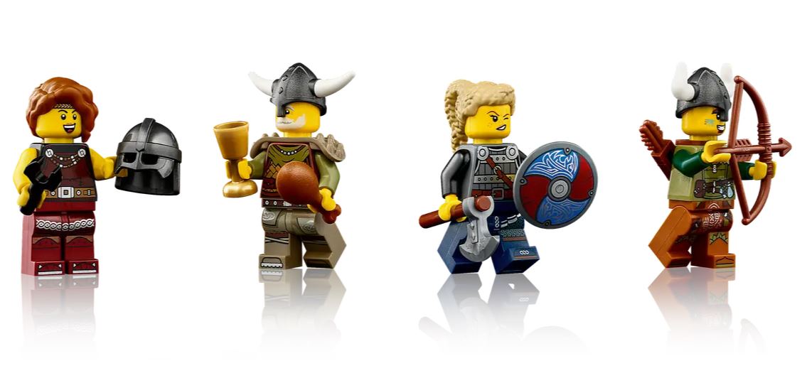 - 4 minifigures A blacksmith, chieftain, shield-maiden and an archer, plus weapons and accessory elements including multiple shields, a paintbrush, hammer, sword, spear, goblet and a bow and arrow