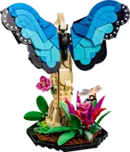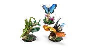 The blue morpho butterfly has adjustable wings featuring LEGO elements in different shades of blue and is displayed with a buildable flower and a honeybee. The Hercules beetle has attachable wings and the characteristic horns of the male of the species, while the fully posable female Chinese mantis (a species of praying mantis) comes with a 7-spotted ladybug. Separate building instructions are included for each model, so you can build solo or with others.
