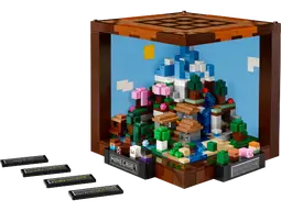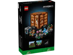 The set recreates the game’s iconic crafting table. Inside are 5 mini build modules featuring 12 Minecraft biomes, including the Taiga with a dripstone cave, Plains with a village, Ice Spikes with an igloo, Cherry Grove with an abandoned mineshaft, and the Deep Dark with a lush cave. 8 microfigures are also included: Steve, Alex, a skeleton, witch, Creeper™, villager, cow and pig. The mini builds and microfigures detach from the main model to enable a variety of display possibilities. Stickers featuring memorable in-game phrases can be added to the front of the Minecraft model. For convenience, a digital version of the set’s building instructions can also be found on the LEGO Builder app.