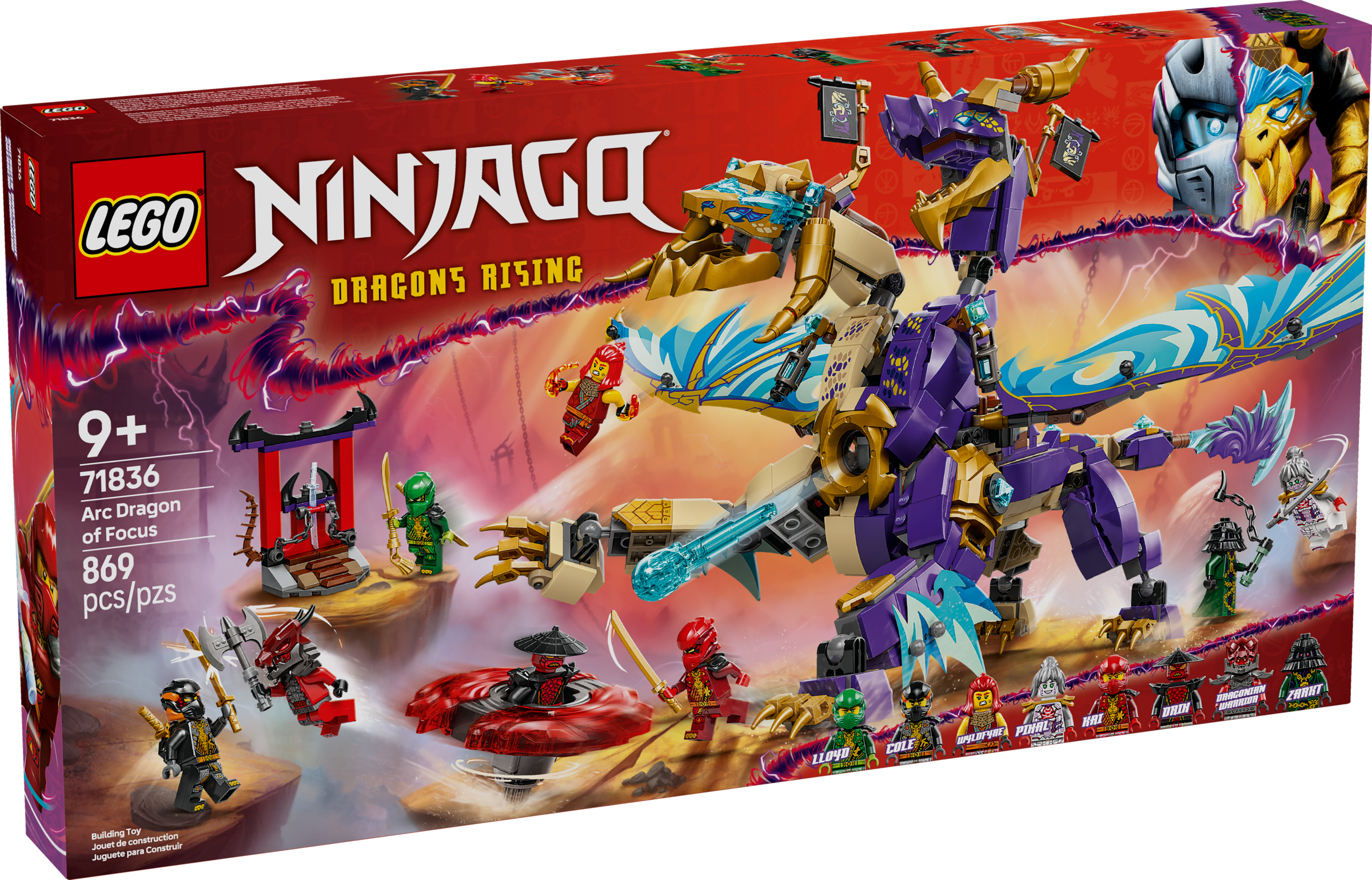 Delight boys and girls aged 9 and up with this LEGO® NINJAGO® Arc Dragon of Focus (71836) ninja toy that lets them role-play epic action scenes from season 3 of the NINJAGO Dragons Rising TV show. This building kit features a 2-headed dragon figure with posable tail, legs, feet, head, neck, jaw and claws. Kids can activate a shooter in its chest and move its large foil wings back and forth using a lever on its back. This battle playset includes 8 NINJAGO character minifigures for ninja fans to stage action-packed adventures. Find ninja warriors Lloyd, Cole, Wyldfyre and Kai, and their ally Pixal, each with a ninja weapon accessory, plus villains Drix, Zarkt and a Dragonian Warrior with their own weapons. For more play value, the LEGO set comes with a cool spinjitzu spinner vehicle. Kids can place a minifigure inside and press a button on its launcher that fires it into a rapid spin, then watch as 2 power elements possibly fly off as it hits its target.