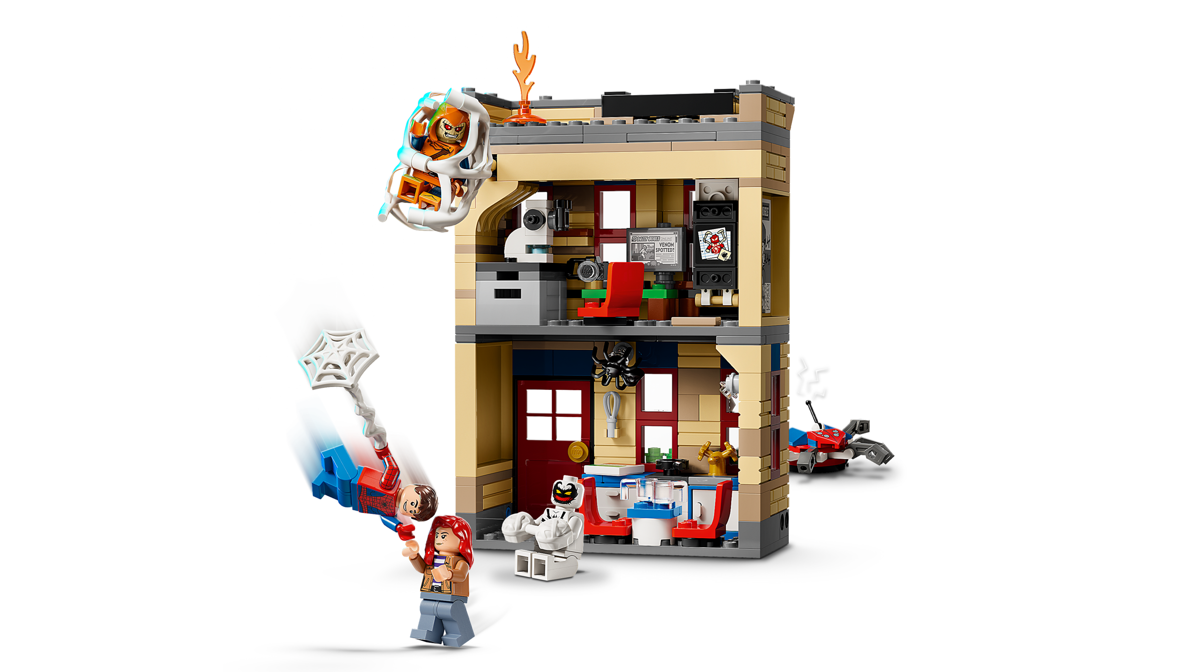 - LEGO® ? Marvel Spider-Man accessories – The 2-level apartment contains a kitchen, study and bedroom and features a giant, flexible, minifigure-trapping web attached to the outside of the building