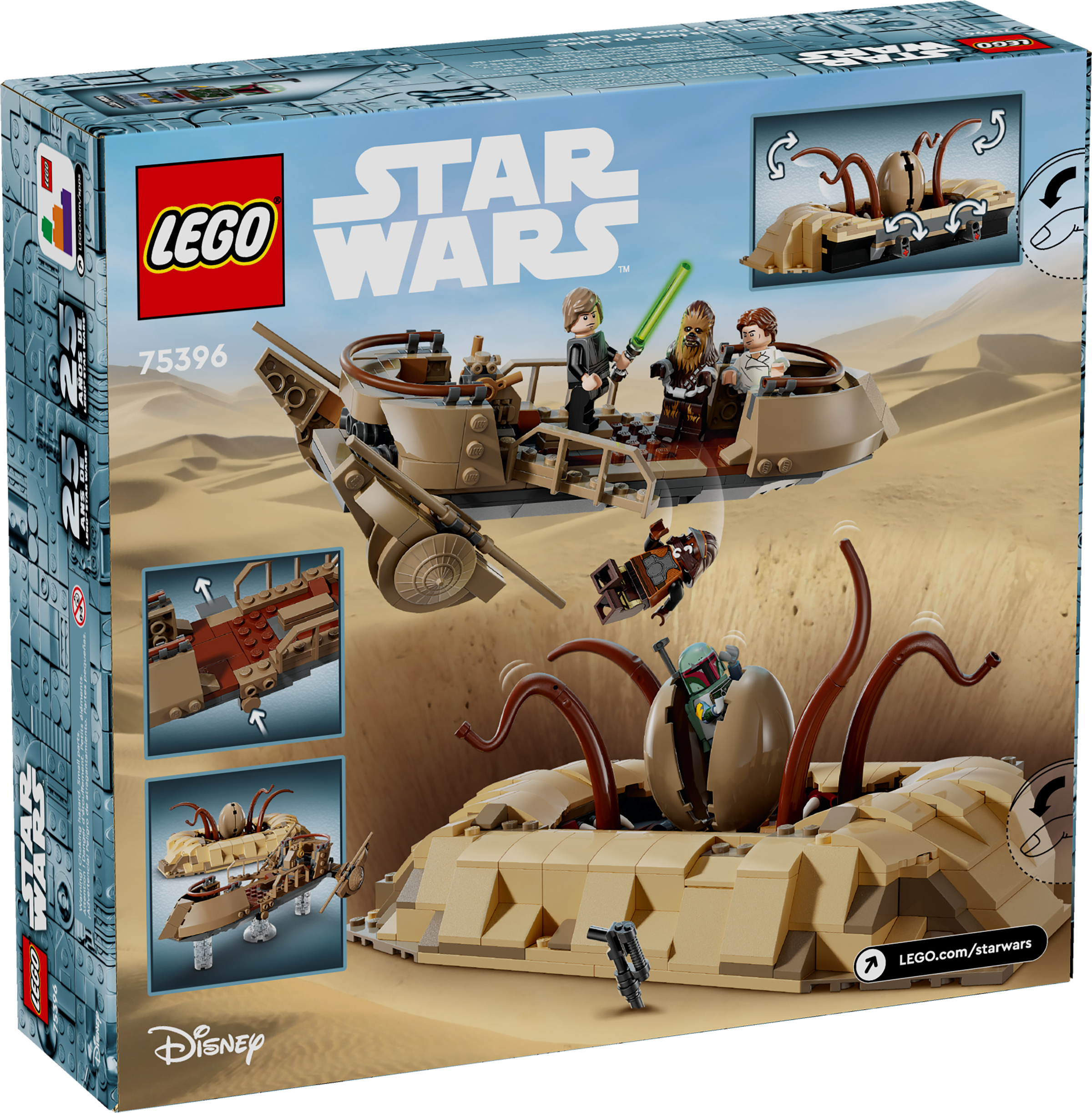 - Buildable LEGO® Star Wars™ toy vehicle – The desert skiff features translucent elements for a hover effect, a plank for Luke Skywalker to walk and the breakaway railing where Han Solo nearly fell off