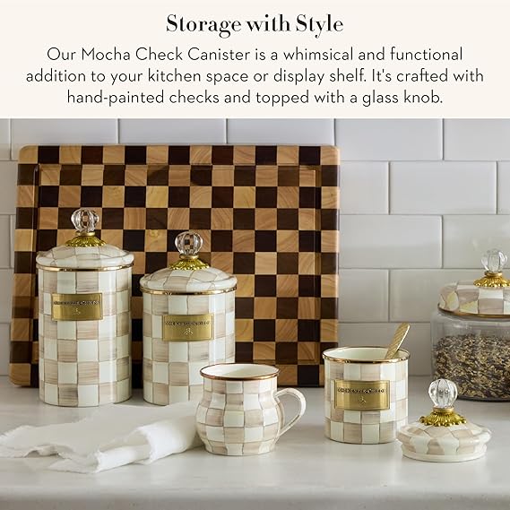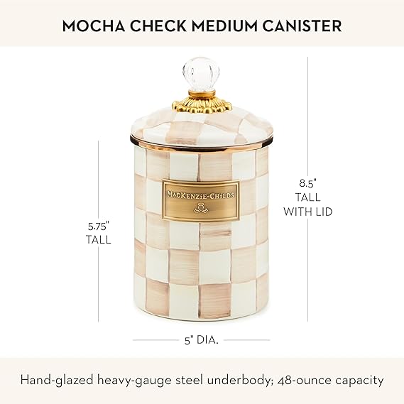 Medium Enamel Canister, Kitchen Storage Container with Lid, Brown-and-White Mocha Check